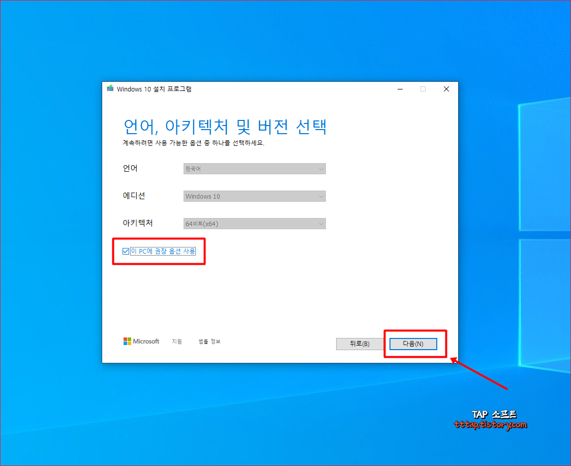 ▼ 5. 언어, 아키텍처 및 버전 선택 메뉴에서 권장 옵션을 선택해줍니다. 보통 64비트로 설치됩니다. 언어를 한국어가 아닌 다른 나라로 선택도 가능합니다.