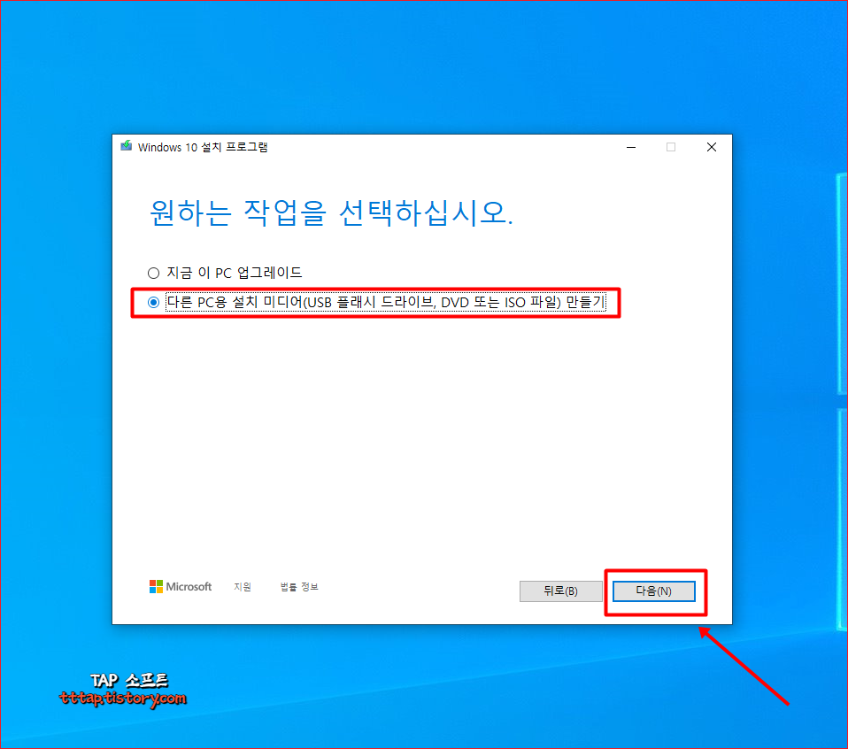 ▼ 4. 다른 PC용 설치 미디어 (USB 플래시 드라이브, DVD 또는 ISO 파일) 만들기를 선택합니다. 참고로 지금 이 PC 업그레이드는 윈도우를 업그레이드 하는 메뉴입니다.