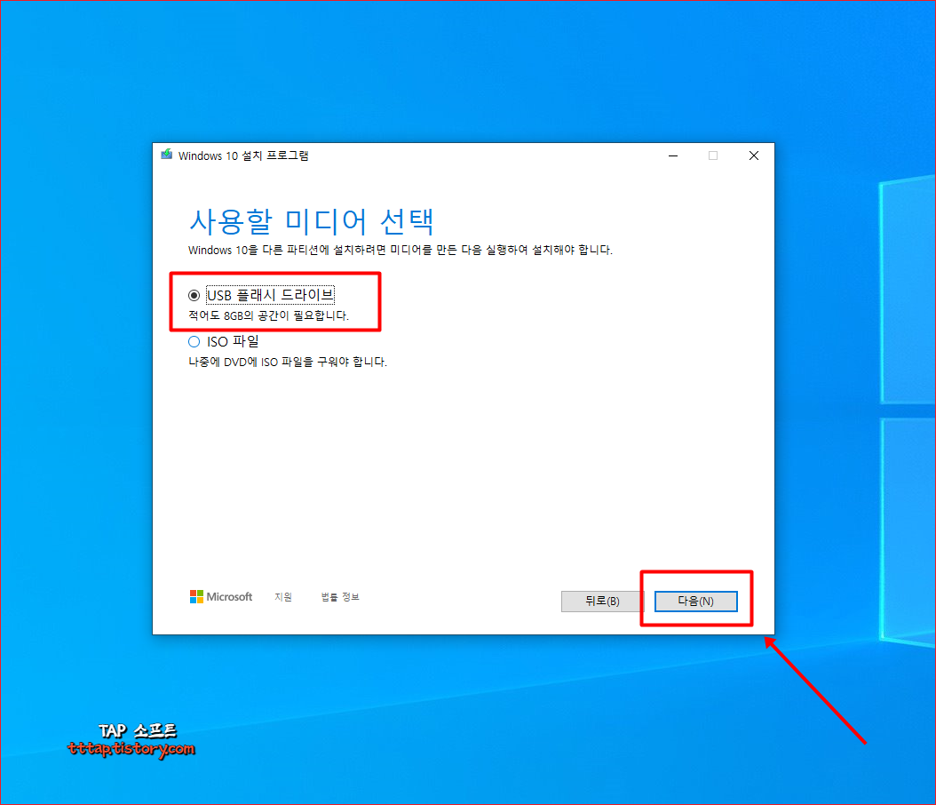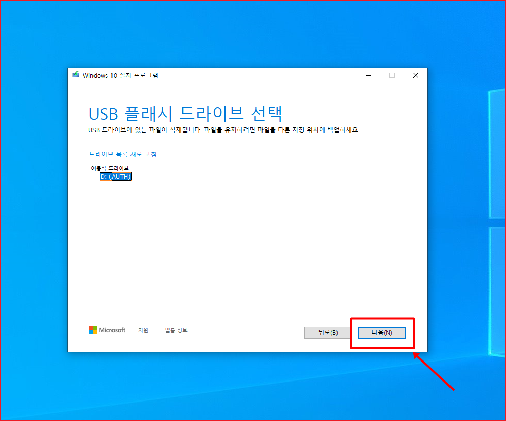 ▼ 7. 마지막으로 USB를 넣고 다음 버튼을 눌러 USB를 만듭니다.
