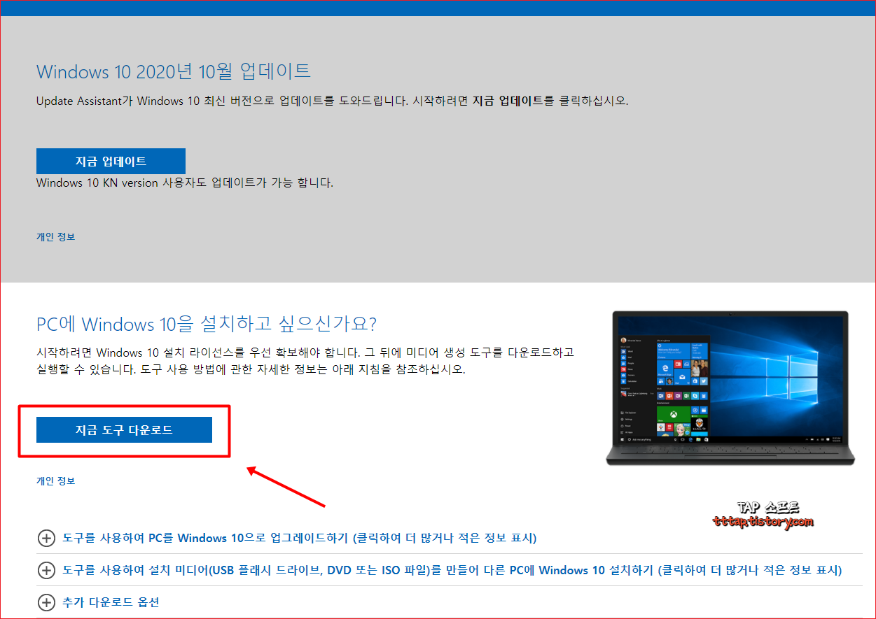 ▼ 1. 위의 마이크로 소프트 웹사이트로 이동해서 지금 도구 다운로드 버튼을 클릭해 파일을 다운로드 받습니다.