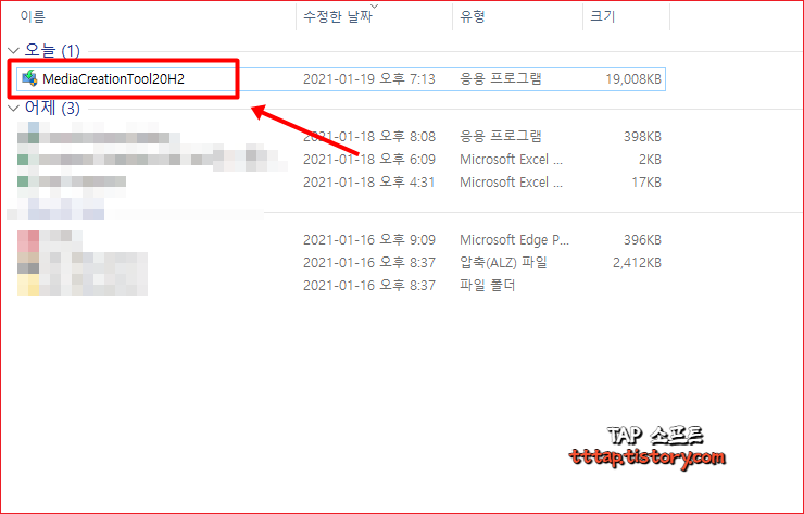 ▼ 2. 다운로드 받은 MediaCreationTool20H2.exe 프로그램을 실행시킵니다.