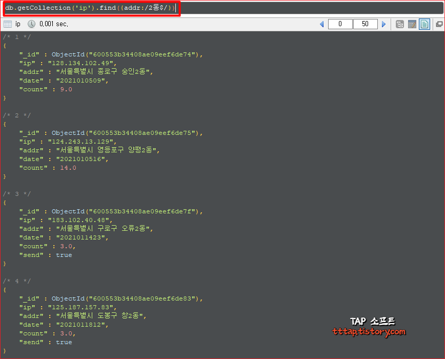 db.getCollection('ip').find({addr:/2동$/})