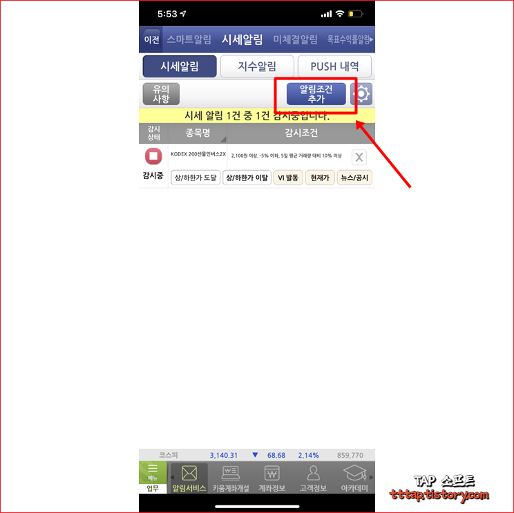 ▼ 5. 시세알림에서 알림조건추가 메뉴를 선택합니다.