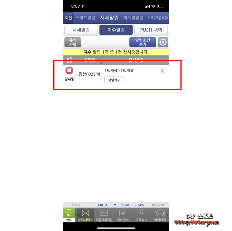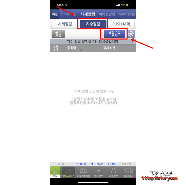 ▼ 1. 지수알림 탭을 선택하고 알림 조건 추가버튼을 누릅니다.