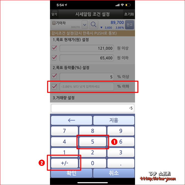 6-2. 목표 등락률 (%) 설정 - 특정 퍼센트 이상, 이하에 알림이 울립니다.