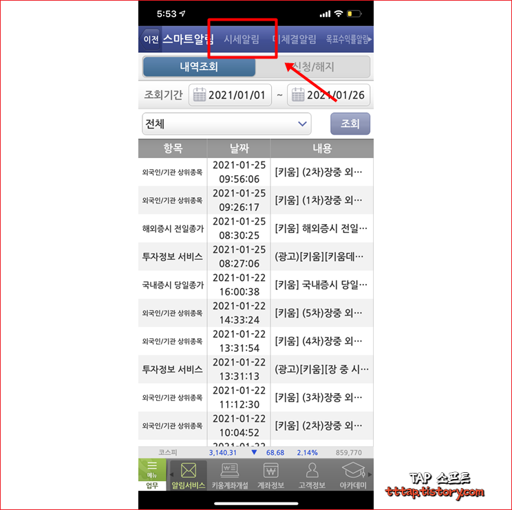 ▼ 4. 두 번째 메뉴인 시세알림 메뉴를 선택합니다.