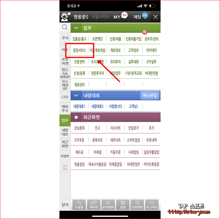 보통 주식 앱들은 거래 및 체결 시 자동으로 푸시가 오기 마련입니다. 하지만 영웅문 S 는 시세 알림을 직접 설정해줘야 푸시 알림이 옵니다. 저도 처음에는 푸시 알림이 없는 줄 알고 카카오 알림으로 사용했었는데요. 생각보다 알림이 늦게 오고 시간 차이가 있게 푸쉬됩니다. 그래서 자세히 알아본 결고 영웅문 S 업무 메뉴에 있습니다. 그럼 간단하게 영웅문 S 에서 시세 알림을 설정하는 방법을 알아보겠습니다.