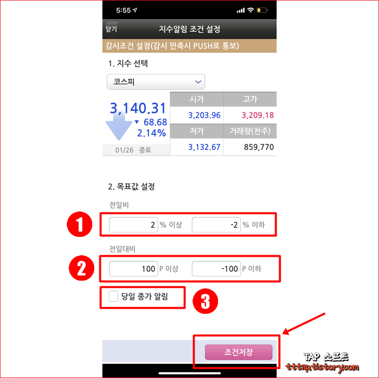 2-2. 전일대비 몇 포인트 이상, 이하시 알림이 옵니다.