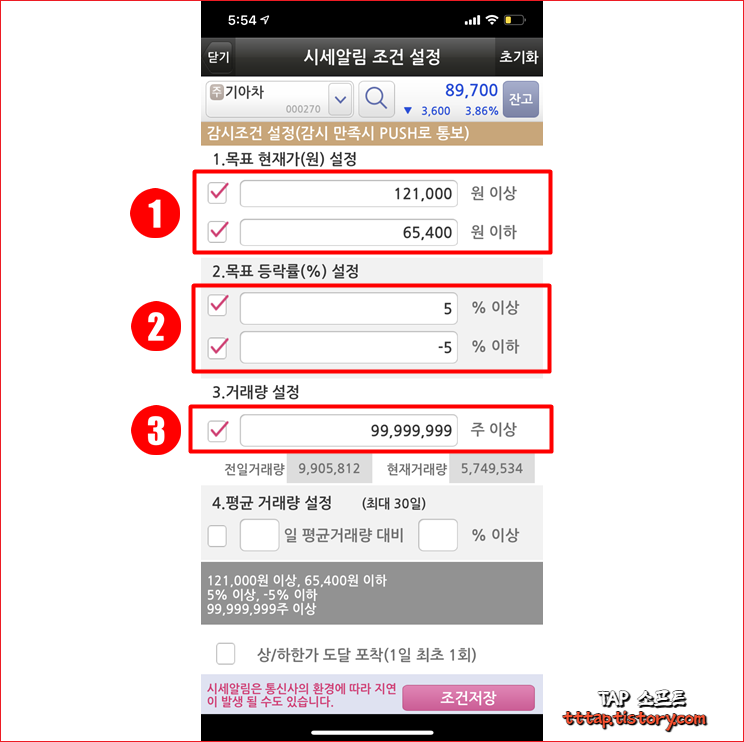 ▼ 6. 시세 알림 조건 설정 화면입니다. 다음과 같은 기능이 있습니다.