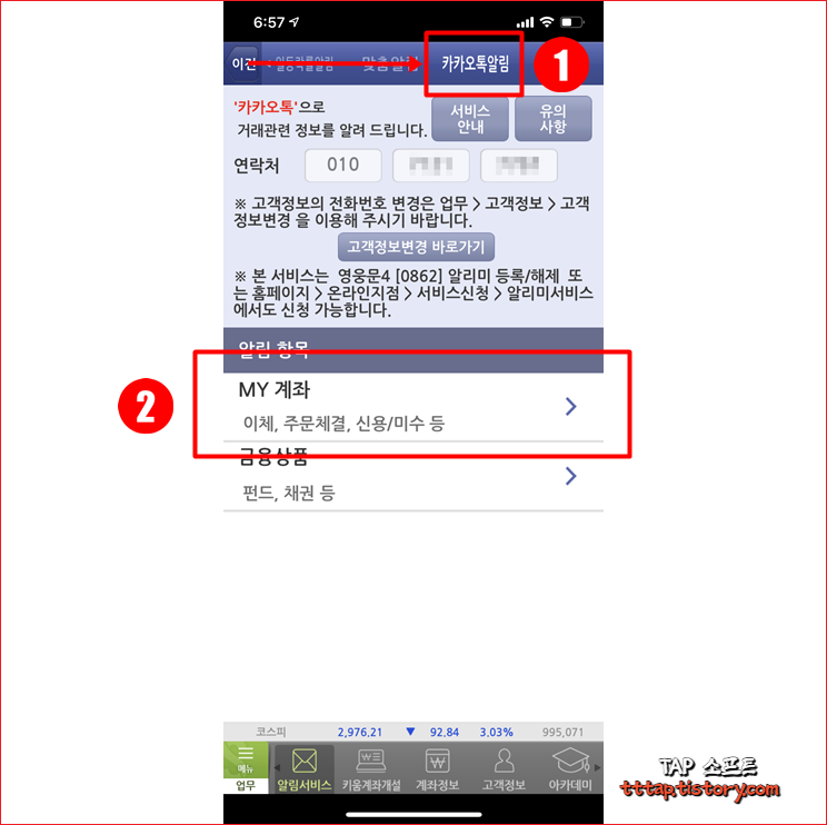 ▼ 3. 상단의 메뉴에서 스크롤해서 맨 끝으로 이동해 카카오톡 알림 메뉴를 누릅니다. 연락처를 확인하고 알림 항목 중에서 MY 계좌를 누릅니다.