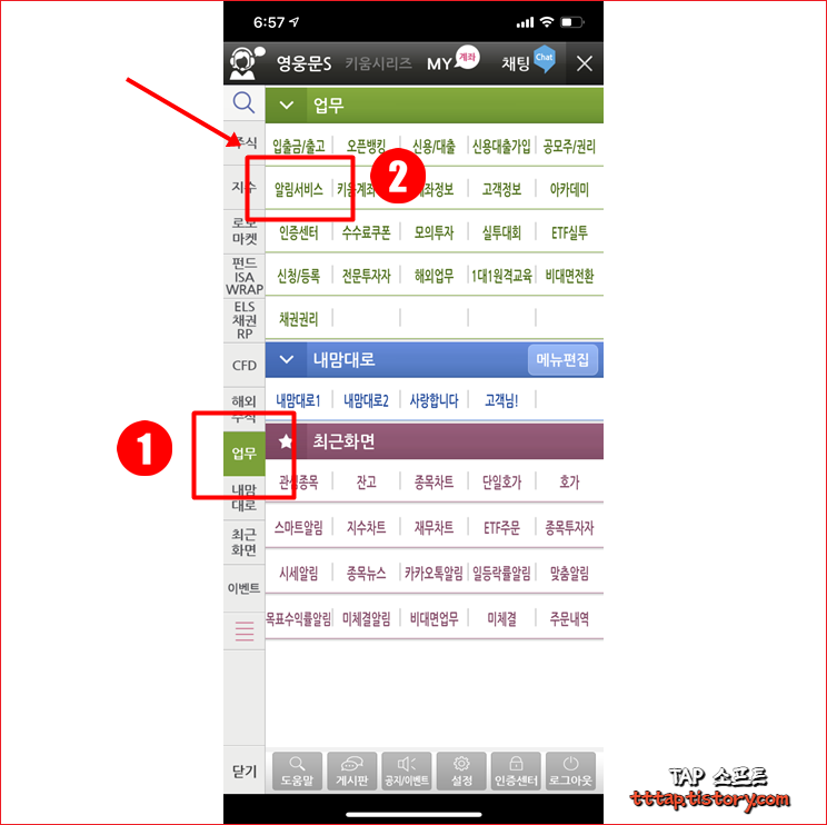 ▼ 2. 업무 탭을 선택하고 알림서비스를 누릅니다.