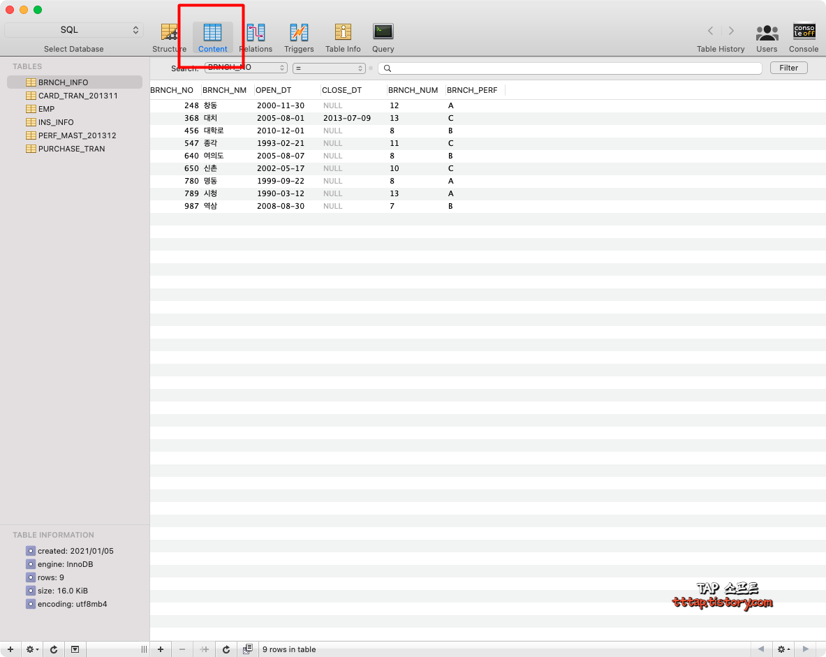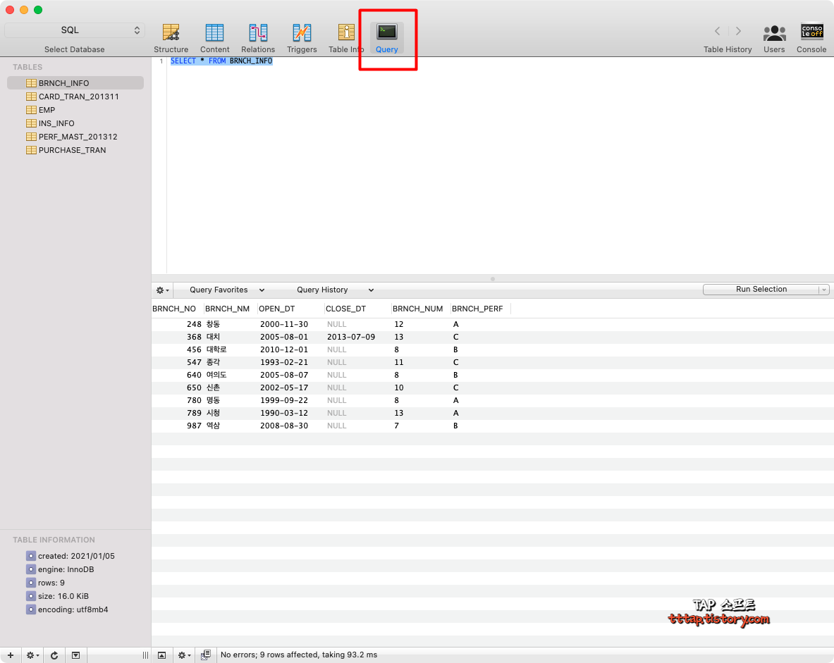 ▼ 6. Query 탭에서 쿼리를 통해 SQL 구문을 실행할 수 있습니다.