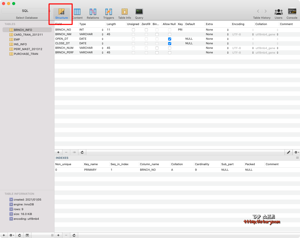 ▼ 2. 첫번째 탭은 데이터베이스 테이블 구조 화면입니다.