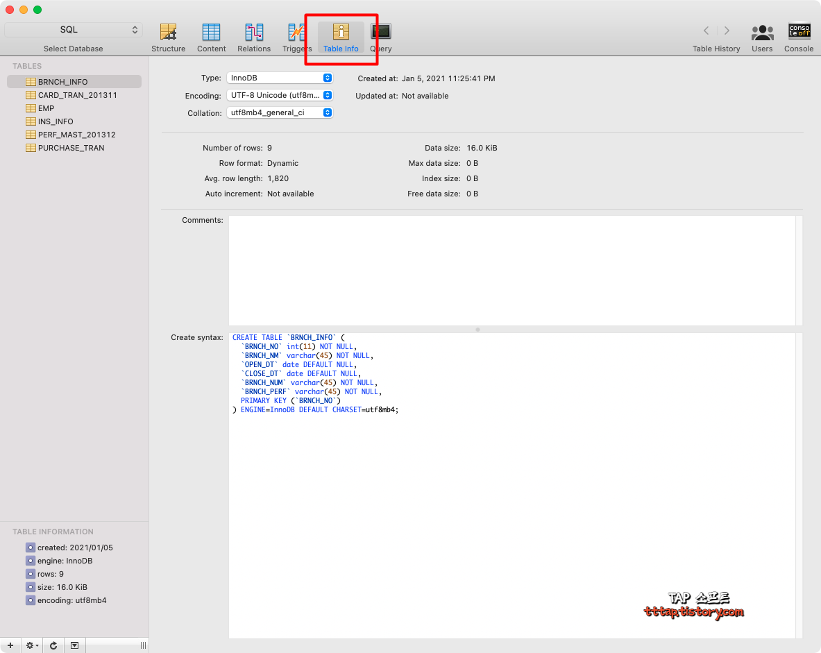 ▼ 5. Table Info에서 테이블에 대한 스키마 정의를 볼 수 있습니다.