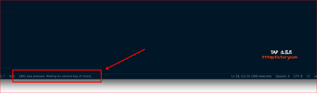 ▼ 2. Command + K 를 누르면 하단 스테이터스 바에 (⌘K) was pressed. Waiting for second key of chord... 라는 메시지가 뜹니다. 이때 F 키를 눌러줍니다.