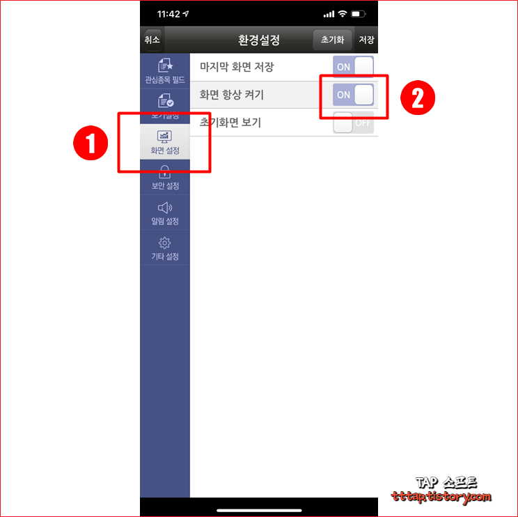 ▼ 3. 환경설정 메뉴의 왼쪽 탭 메뉴중에 화면 설정 버튼을 누르고 화면 항상 켜기 스위치 버튼을 ON 상태로 켜줍니다.