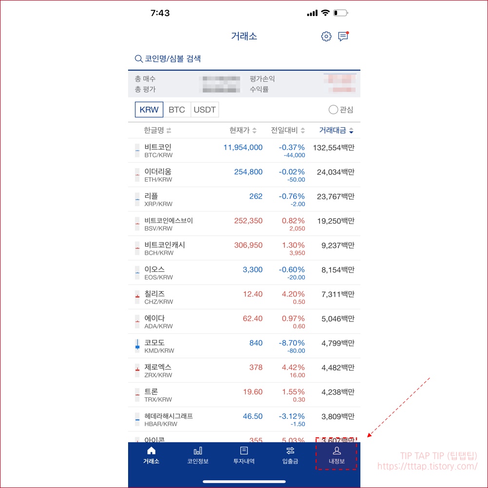 ▼ 1. 우측 하단에 내정보 버튼을 클릭합니다.