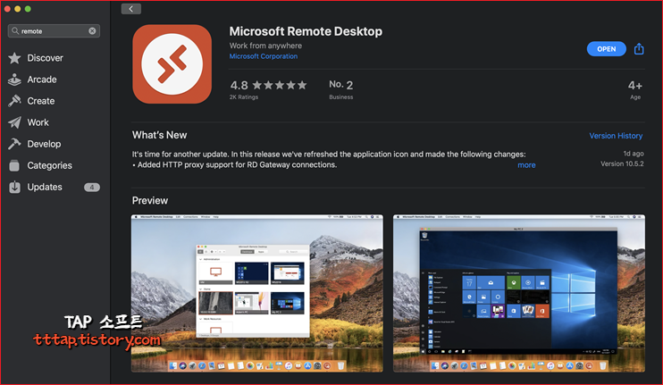 ▼ 1. 앱스토어에서 remote 라고 검색하면 다음 Microsoft Remote Desktop을 찾을 수 있습니다. 설치 버튼을 눌러 설치하고 앱을 실행합니다.
