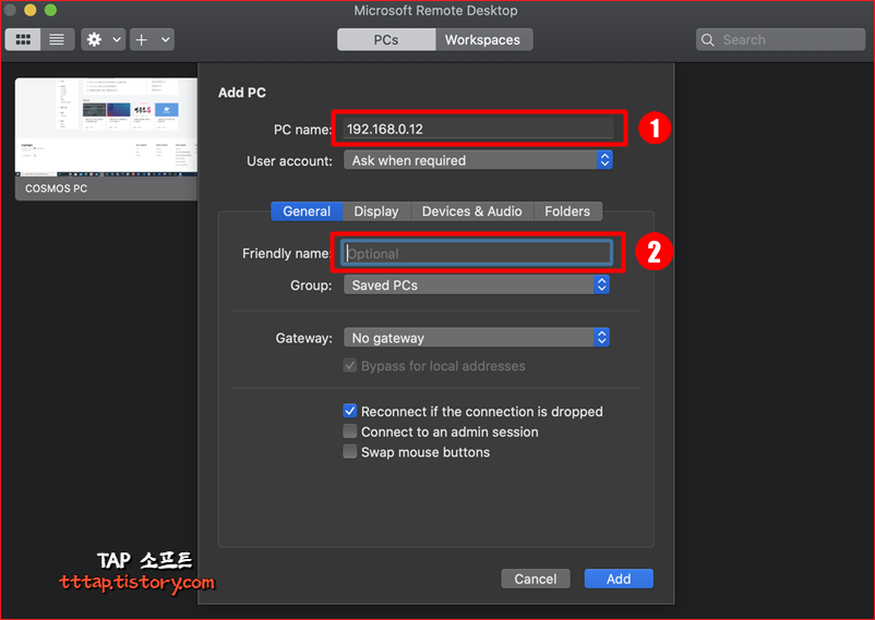 ▼ 3. PC name에 접속할 호스트 주소 또는 이름을 입력합니다. 쉽게 알아볼 수 있도록 Friendly name을 추가할 수 있습니다.