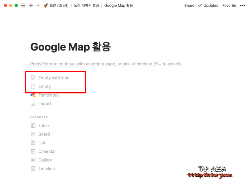 ▼ 1. 노션에서 구글 맵 (Google Map) 을 삽입할 [새로운 페이지] 를 만들어줍니다.