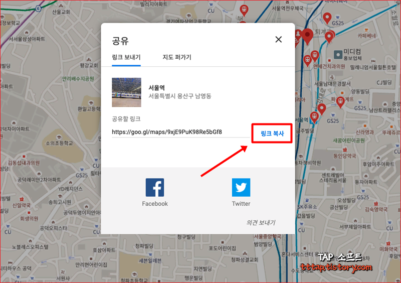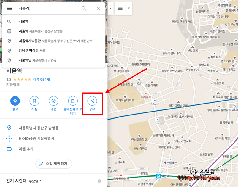 ▼ 2. 구글 지도 www.google.co.kr 에서 특정 위치를 검색하고 [공유 버튼]을 누릅니다. 저는 서울역을 검색했습니다.