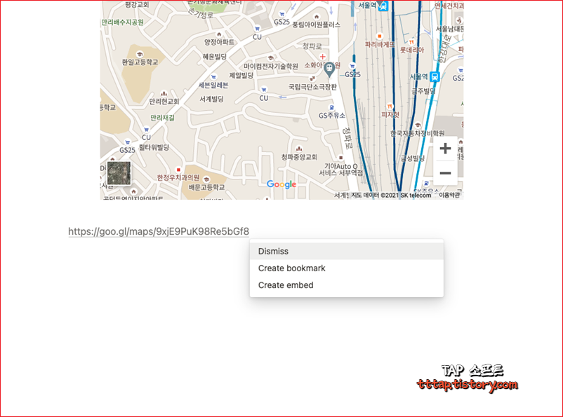 ▼ 7. 또 다른 방법으로 복사된 구글 지도 링크를 붙여 넣고 팝업 창에서 [Create embed] 를 이용해 추가하는 방법도 있습니다. [Create bookmark] 의 경우 웹 주소를 그대로 추가하는 것이니 혼동하면 안 됩니다.