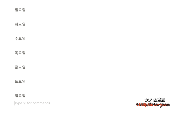 ▼ 1. 우선 단을 나누기 앞서 테스트를 위해 월요일 부터 일요일까지 [텍스트 블록을 생성] 합니다.
