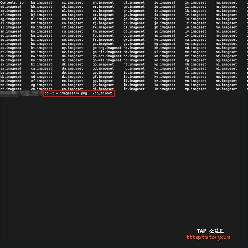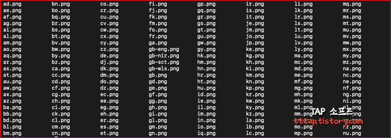 다음과 같은 폴더 구조의 데이터를 옮기려고 했는데 막막하더군요. 국기 이미지가 들어있는 폴더입니다. 문제는 .imageset 폴더 안에 각각 국가코드.png 이미지가 들어있습니다. 이제 하위 구조를 복사하는 방법을 알아보겠습니다.