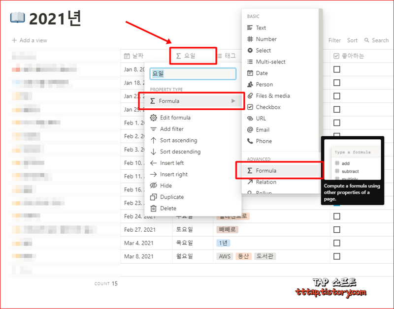 ▼ 2. 이번에 새로 만든 2021년 일기 템플릿 입니다. 우선 변경할 컬럼을 선택해서 [ Formular ] 로 변경해 줍니다.
