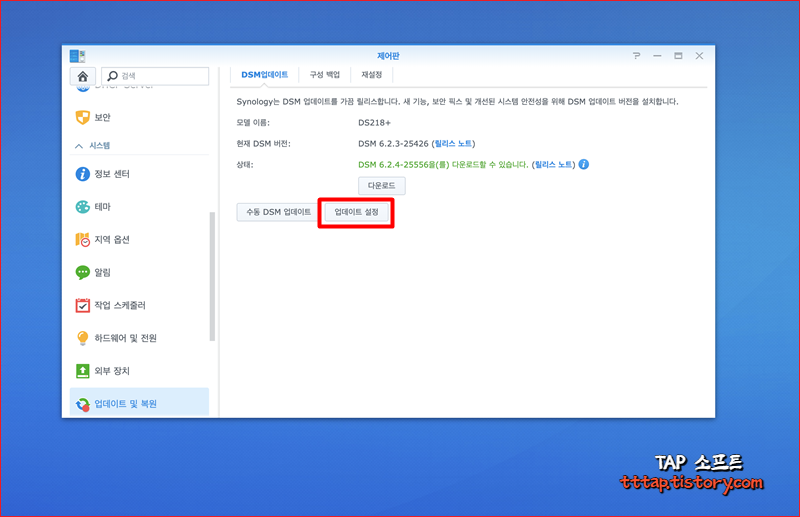 ▼ 3. 제어판의 DSM업데이트 탭에서 [ 업데이트 설정 ] 버튼을 눌러줍니다.
