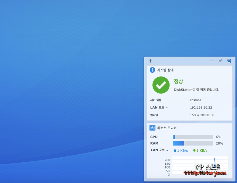 ▼ 1. 시놀로지의 [ 시스템 상태 ] 메뉴를 보면 업타임 시간을 알 수 있습니다. 현재 158 일 정도 켜져 있다는 것을 알 수 있죠. 만약 자동 업데이트를 한다면 꽤 자주 업타임이 바뀌는 것을 보실 수 있습니다.