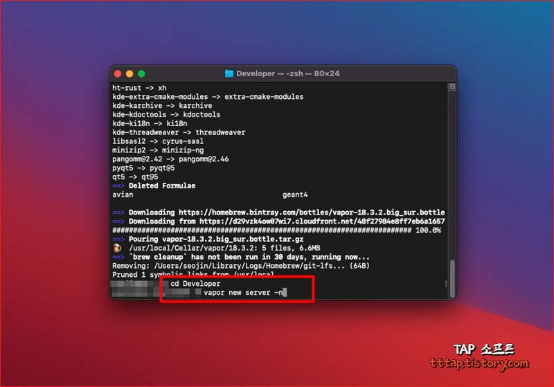 ▼ 2. 새로운 프로젝트를 만들기 위해서 설치할 폴더로 이동한뒤에 다음 명령어를 사용해 새로운 Vapor 프로젝트를 생성합니다. [ vapor new server -n ]