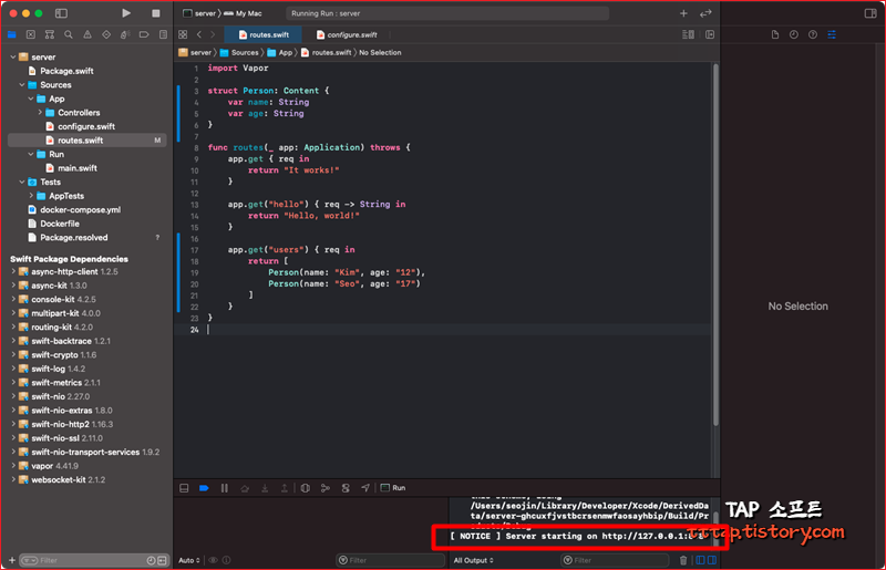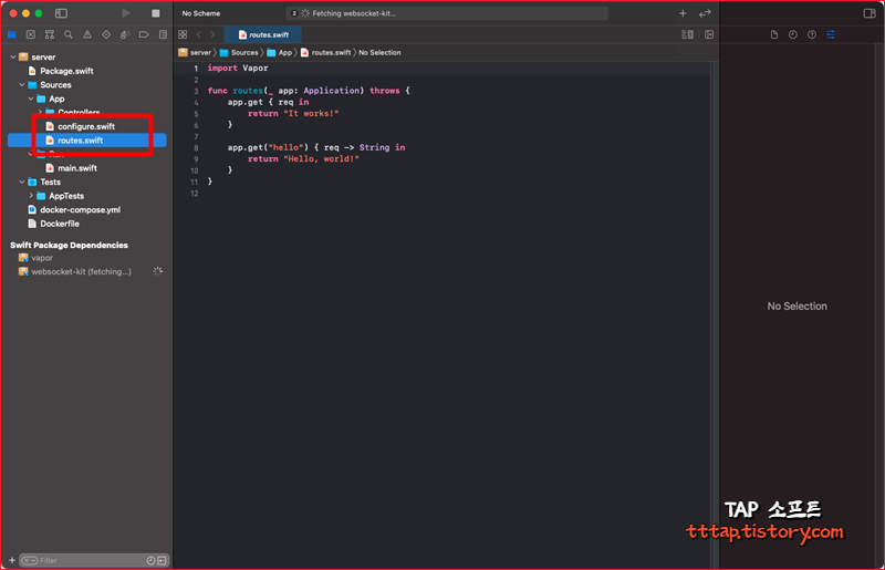 ▼ 4. 새로운 프로젝트가 열리고 다음과 같은 프로젝트 폴더가 구조를 볼 수 있습니다. 이중에 우선 routes.swift만 변경해도 원하는 REST API를 만들 수 있습니다. 그리고 빌드 버튼을 누르면 새로운 패키지를 받고 프로젝트가 실행됩니다.