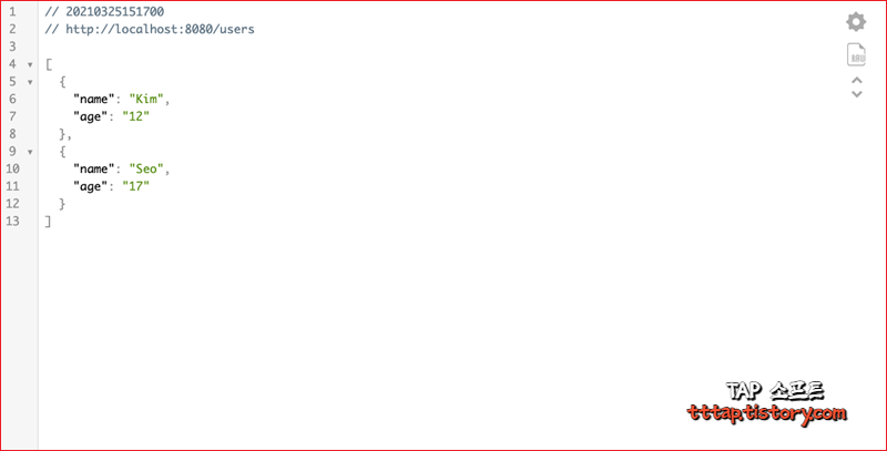 ▼ 1. 이제 [ http://localhost:8080/users ] URL로 이동하면 조금 전에 만들었던 JSON 구조를 반환받을 수 있습니다.
