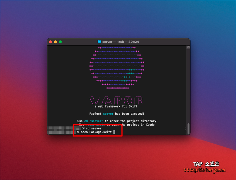 ▼ 3. 새로운 프로젝트가 만들어지면서 물방울 모양의 텍스트가 출력됩니다. server 폴더로 이동한 뒤 다음 명령어를 통해 프로젝트를 열어줍니다. [ open Package.swift ] 직접 파인더에서 Package.swift를 더블 클릭한 뒤 Xcode로 열수도 있습니다.