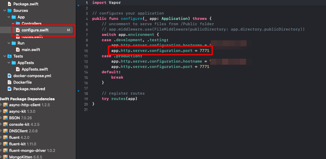 설치후에 다음과 같이 configure.swift 파일을 열어줍니다. 그리고 다음과 같이 app 객체에 http 속성의 포트 설정을 변경할 수 있습니다. 만약 개발 서버와 운영서버를 분리해서 작업하려면 environment 로 패턴 매칭해서 분리 할 수 있어요.