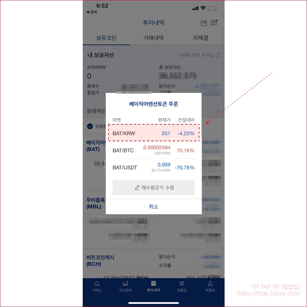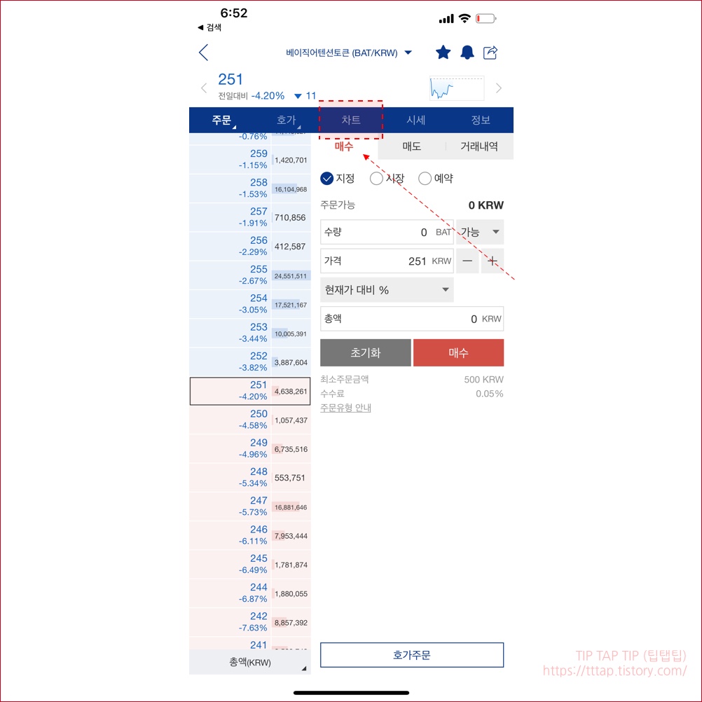 ▼ 3. 다음은 특정코인의 주문 화면입니다. 차트 버튼을 눌러서 차트 화면으로 이동합니다.