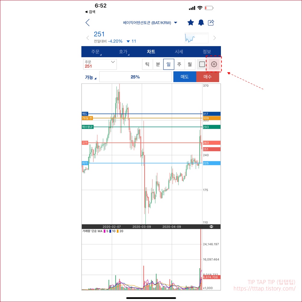 ▼ 4. 차트 화면에서 우측 상단의 차트 설정 버튼을 누릅니다.