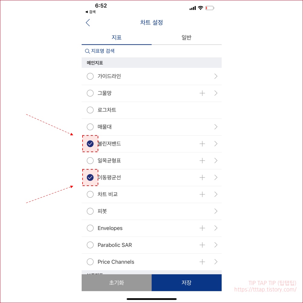 ▼ 6. 일단 두개의 지표를 선택해보겠습니다. 가장 많이 사용되는 이동평균선 그리고 볼린저 밴드를 활성화 합니다. 다른 지표를 선택하셔도 괜찮습니다.