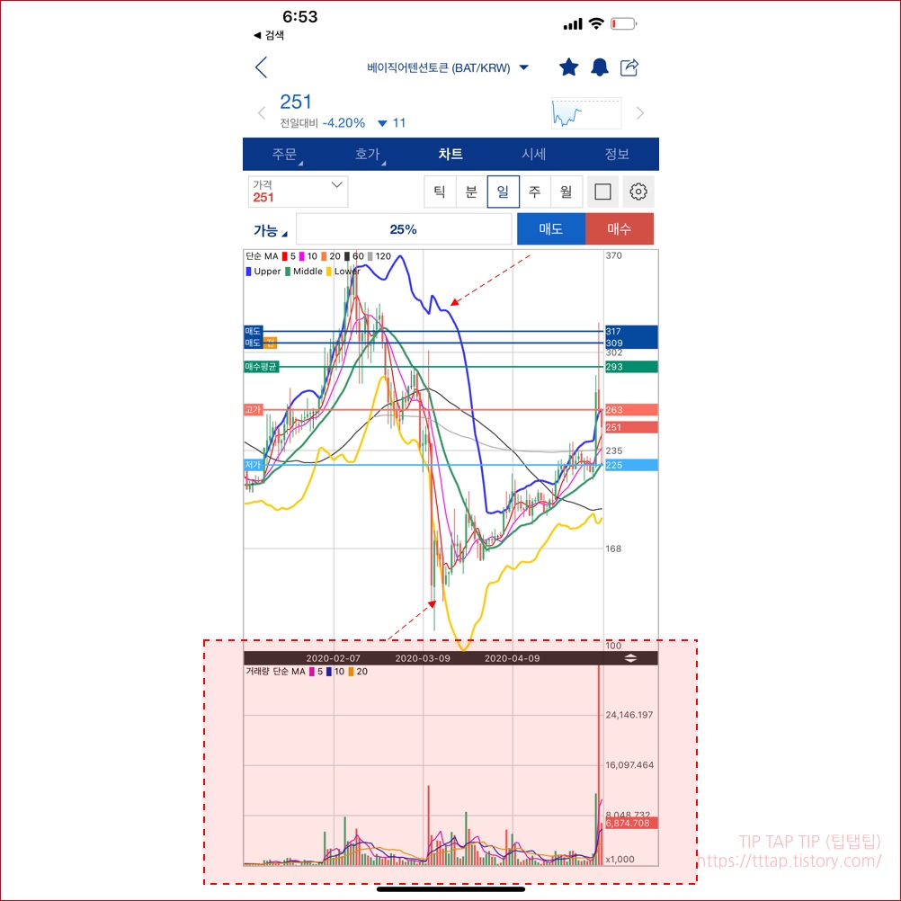 ▼ 7. 화살표가 나타내는 부분이 볼린저밴드 상단과 하단입니다. 밑에 박스 부분은 거래량입니다. 이 역시 키고 끌수가 있습니다.