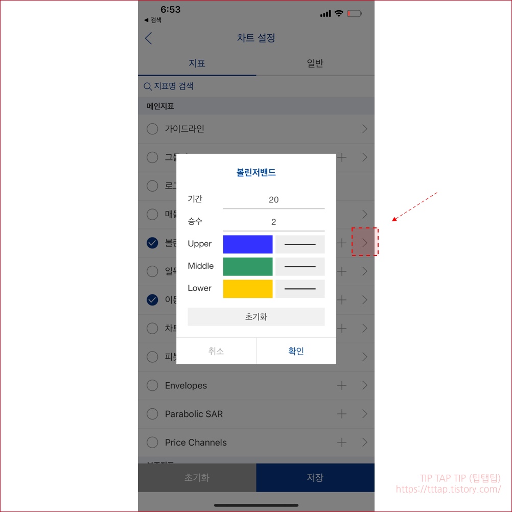▼ 8. 볼린저밴드와 이동평균선의 색상이 비슷해서 잘 보이지 않으면 라인의 색상을 옵션으로 바꿀수 있습니다 차트 설정의 지표로 이동해서 해당 지표의 오른쪽 화살표를 누르면 옵션 창이 나타납니다.