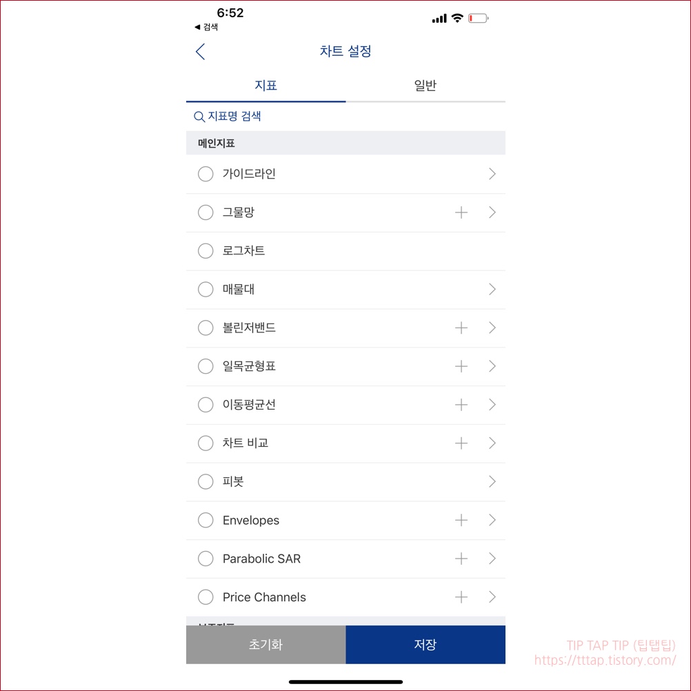 ▼ 5. 차트 설정에서 두가지 탭이 있는데 지표 탭을 선택합니다. 현재는 아무런 지표도 선택되지 않은 상태입니다.