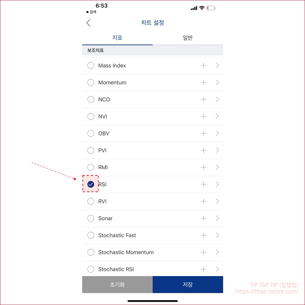 ▼ 10. 메뉴의 아래쪽을 보면 보조지표도 선택할 수 있습니다. 메인지표와 달리 다양한 보조지표가 있네요. 일단 RSI 를 사용해보겠습니다.