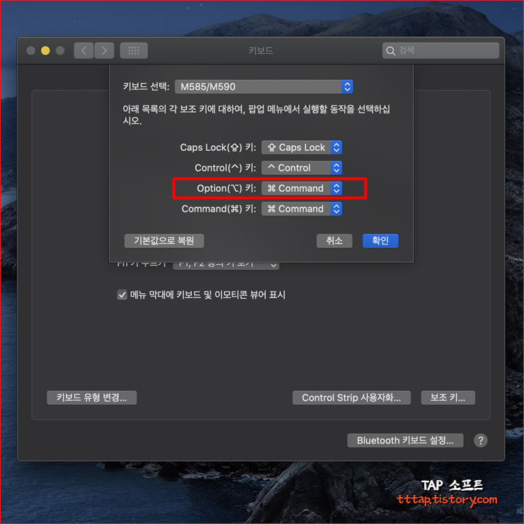 ▼ 6. 윈도우는 옵션 키와 커맨드 키가 반대로 되어 있기 때문에 먼저 [ 옵션키 (Option) ] 를 [ 커맨드키 (Command) ] 로 변경해줍니다.