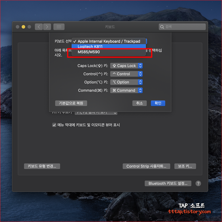 맥을 사고 제일 처음 고민되는 부분이 키보드입니다. 일단 한영키도 CapsLock 버튼으로 동작하고 Ctrl 키가 윈도우랑 역할이 조금 다릅니다. 그리고 가장 어려운 게 Command 키죠. 물론 맥 키보드에 익숙하신 분들은 윈도우 키가 어색하겠지만 Command 키는 맥을 처음 사용하는 사람에게는 조금 어렵게 느껴집니다. 불편하기도 하고요. 보통 이런 키 설정을 하려면 프로그램을 설치해야 하는데 맥에서는 보조키에 대해서 아주 간단하게 변경을 해줍니다. 그런데 흔히 하는 실수 중에 키보드를 정확히 선택하지 않아서 보조키가 안 바뀐다고 생각합니다. 맥북에도 키보드가 있고 새로운 물리 키보드 또는 블루투스 키보드를 사용하기 때문이죠.