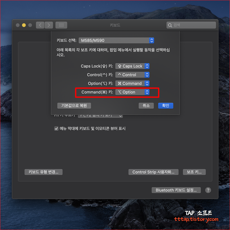 ▼ 7. 이번엔 반대로 [ 커맨드키 (Command) ] 를 [ 옵션키 (Option) ] 로 변경해줍니다.