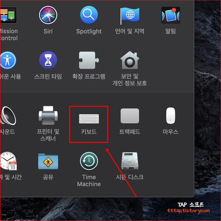 ▼ 2. 맥 설정 전체 메뉴에서 [ 키보드 ] 하위 메뉴를 선택합니다.