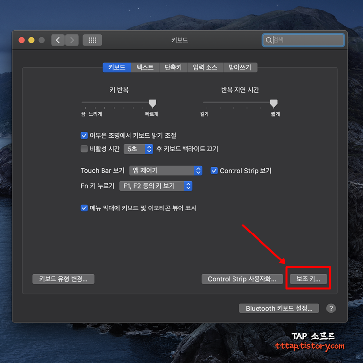 ▼ 3. 키보드 메뉴의 [ 보조키 ] 설정을 눌러줍니다.
