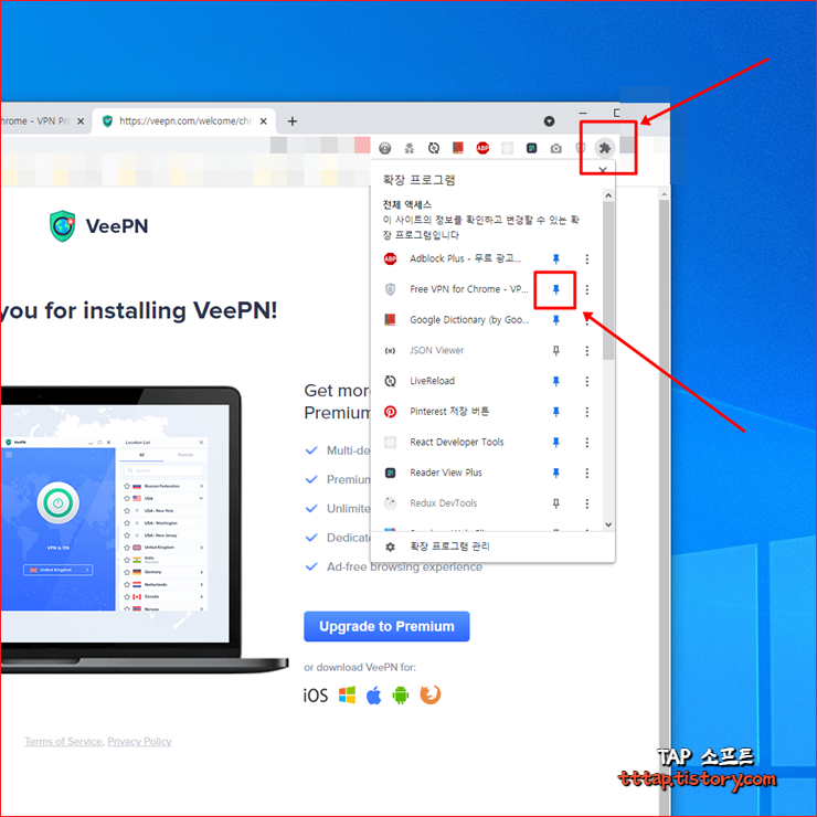 ▼ 3. 좀 더 편하게 사용하기 위해서 우측 상단의 익스텐션 버튼을 눌러 [ Free VPN for Chrome ]를 메뉴를 메뉴바에 등록합니다. 그럼 크롬 메뉴바에서 방패 모양의 아이콘을 볼 수가 있습니다. 메뉴를 선택해 앱을 실행합니다.