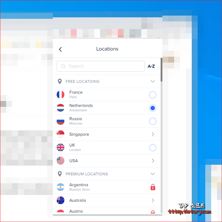 ▼ 6. 다양한 지역을 선택할 수 있습니다. 만약 유료로 사용한다면 더 많은 지역을 선택할 수 있을 것 같습니다. 아르헨티나 오스트리아 같은 곳이 있는데 저곳이 과연 빠를까요? 한국에서는 왠지 느릴 것 같습니다.